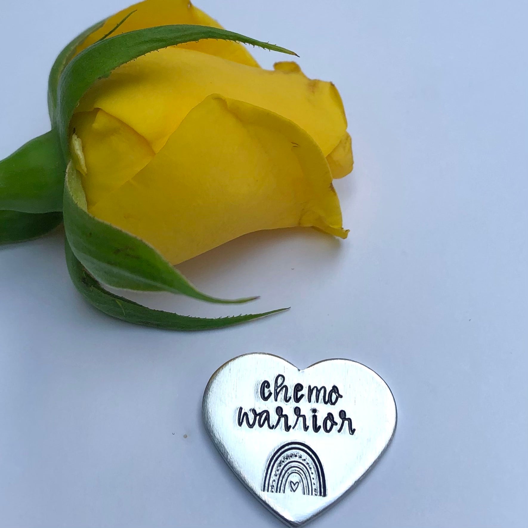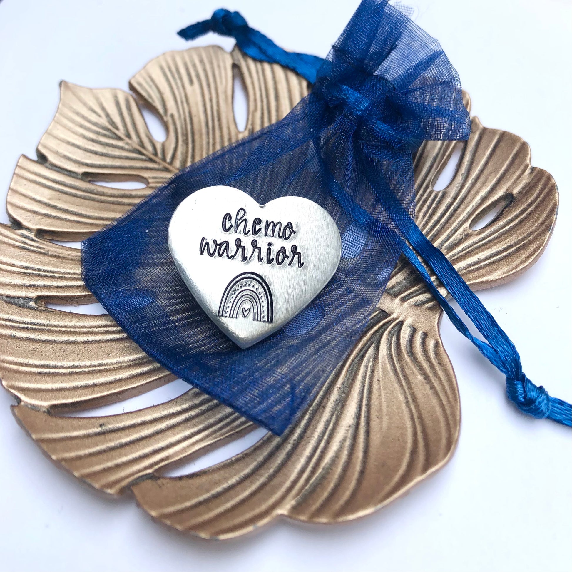 Each heart-shaped aluminium token is hand-stamped with 'Chemo warrior' and a rainbow. At only 25cm wide, these little tokens are perfect to carry in your pocket or purse. Each token comes in a little organza bag in a Bear & Bup gift envelope.