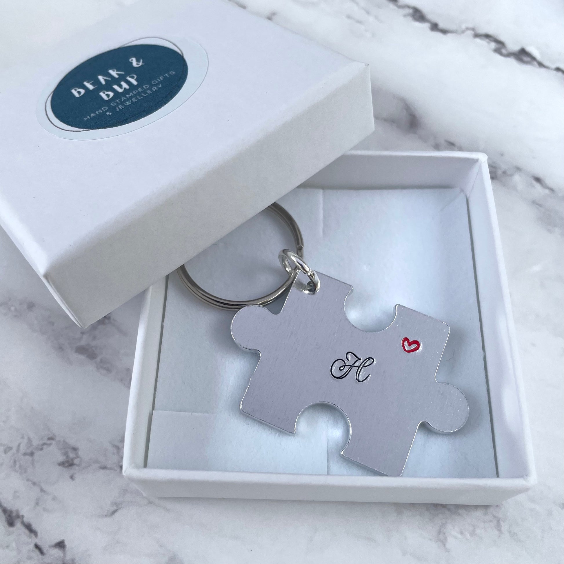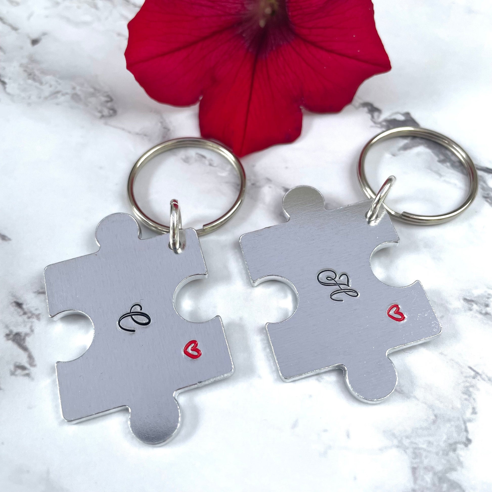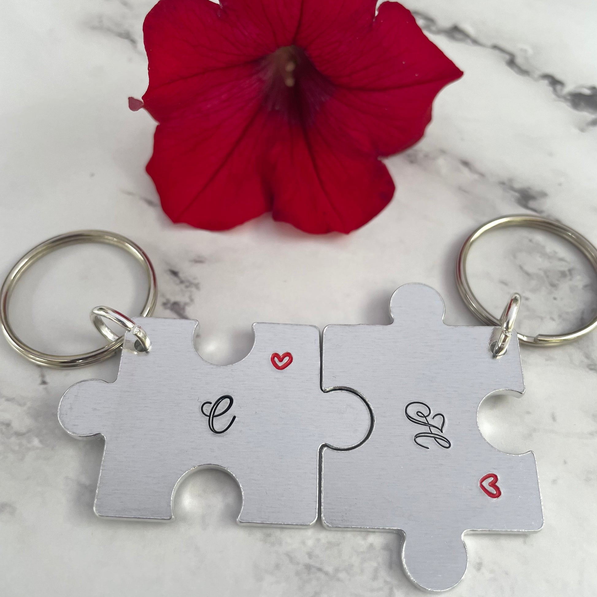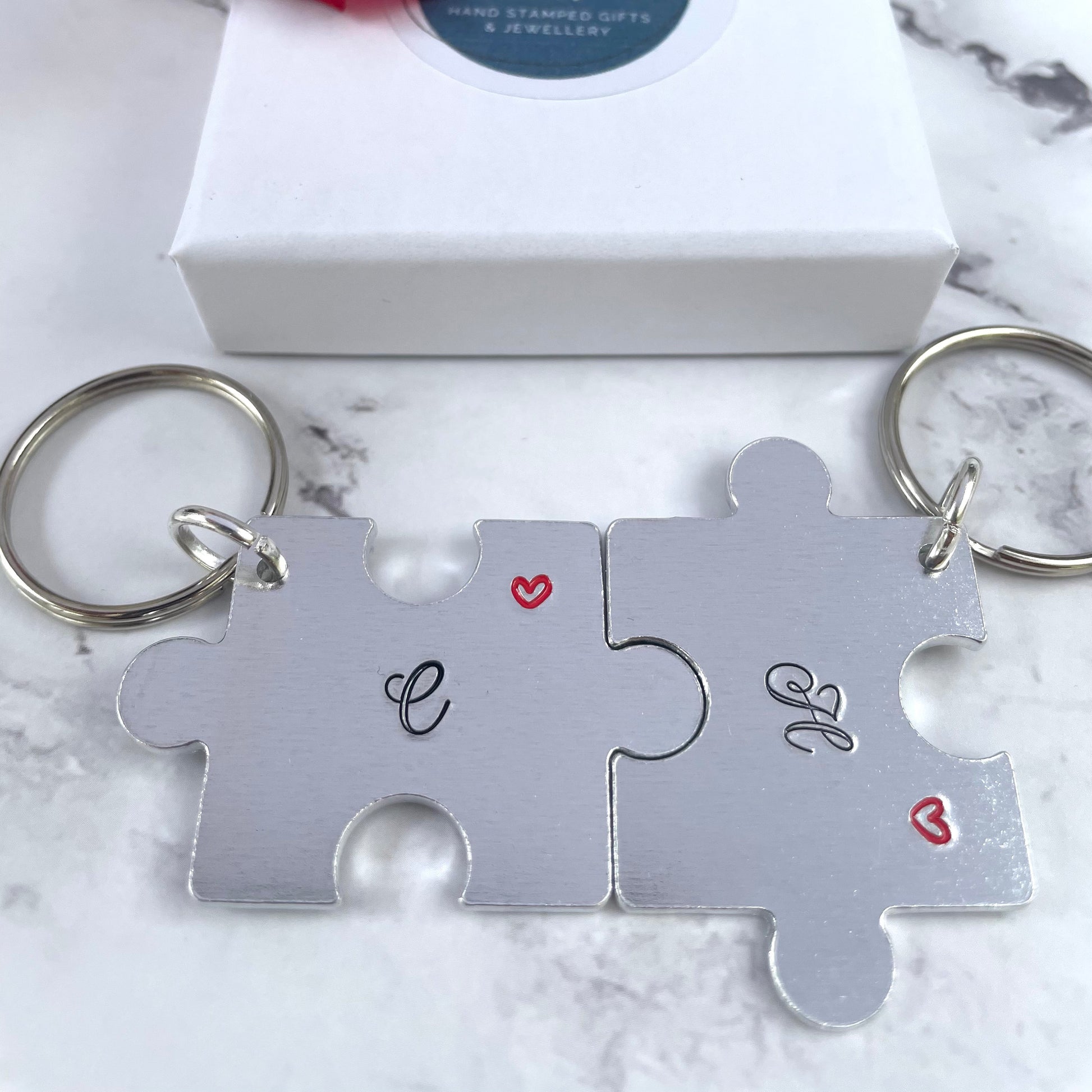 Puzzle piece couples keyrings - interlocking and personalised with each person's initial and a small red heart. Ideal anniversary or wedding gift. Each keyring comes in it's own gift box as shown in the photo. This listing is for a pair of keyrings.