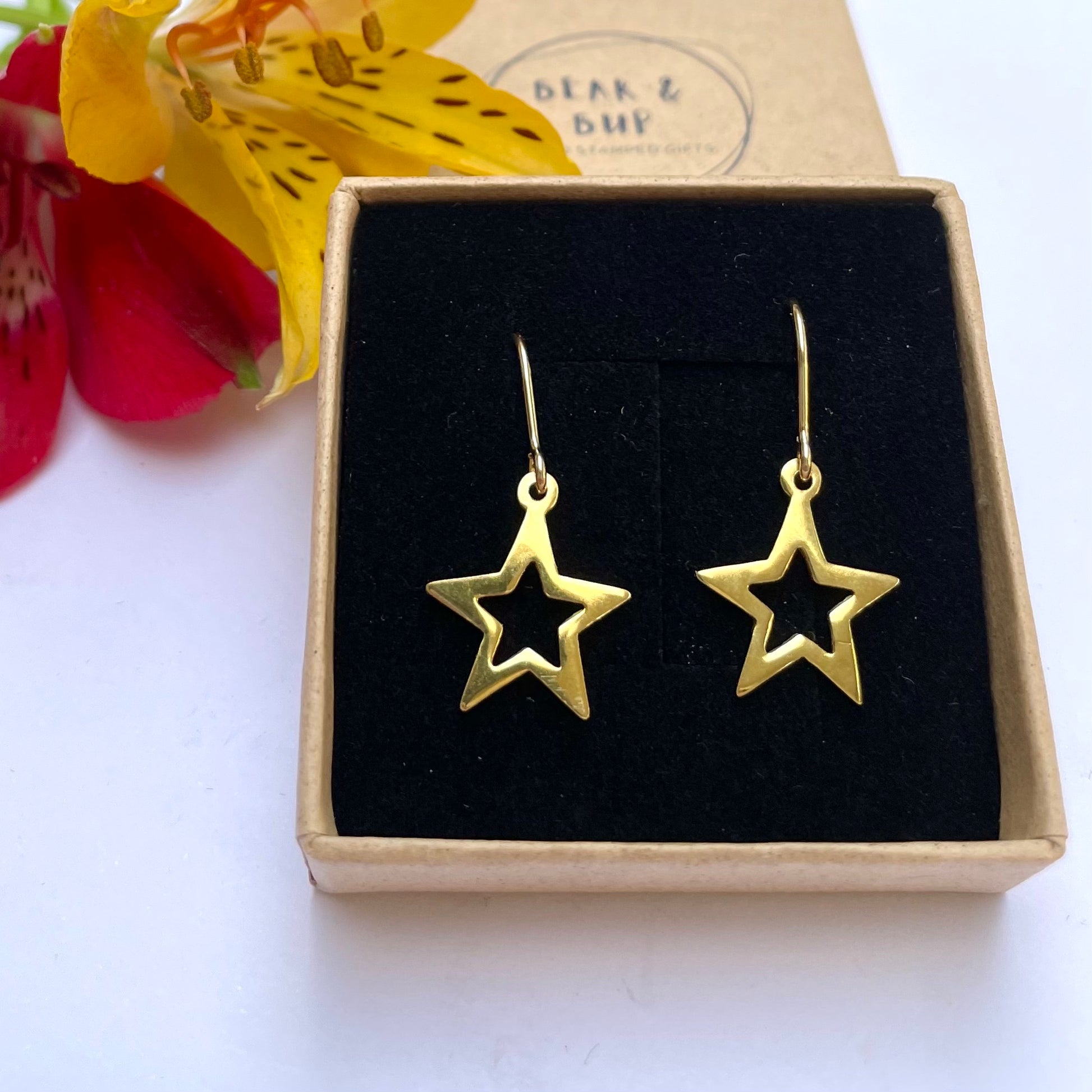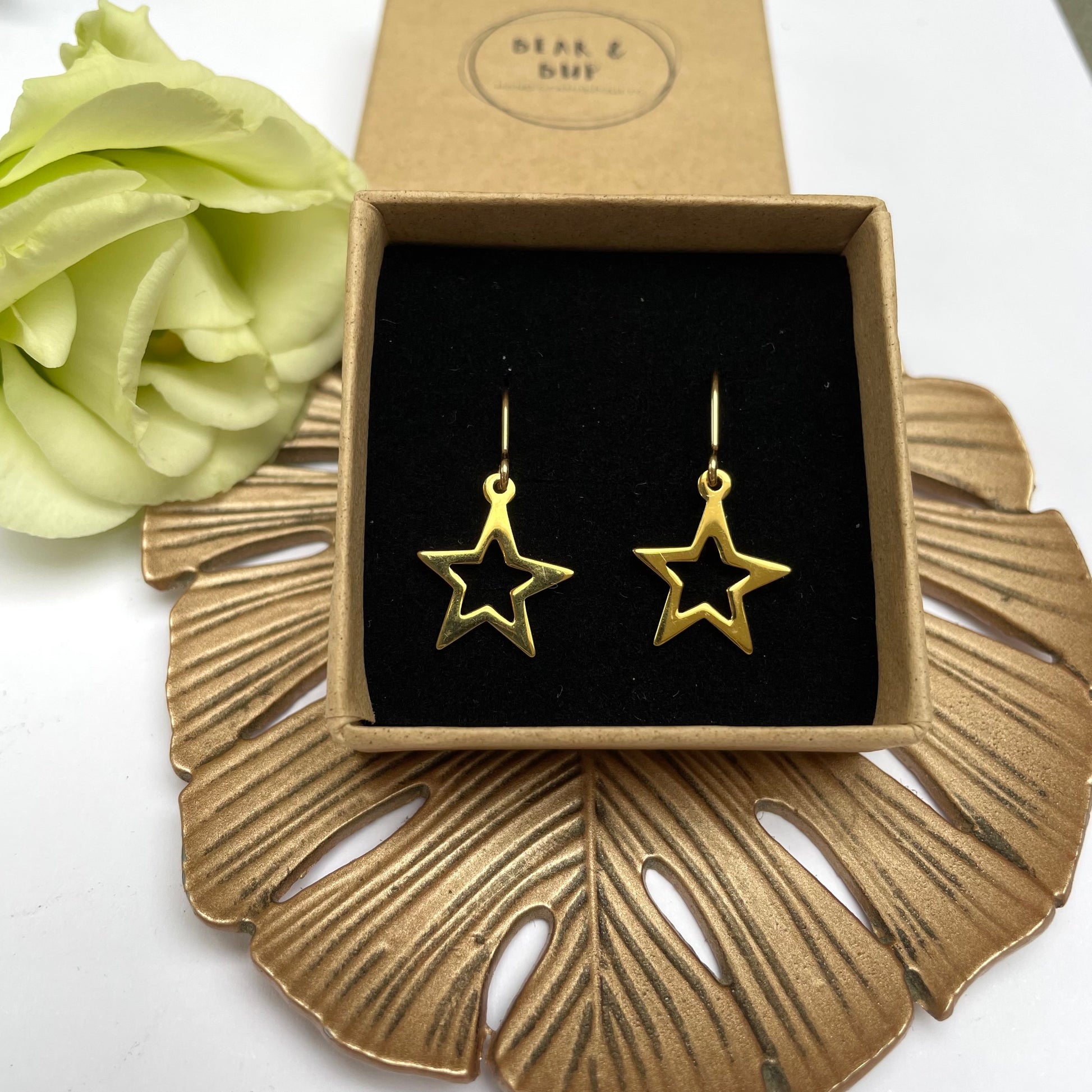 The open star itself is gold plated 925 sterling silver and is 13.5mm across from point to point. It is marked 925 on one side. The ear wires are 14k gold-filled & 18mm.