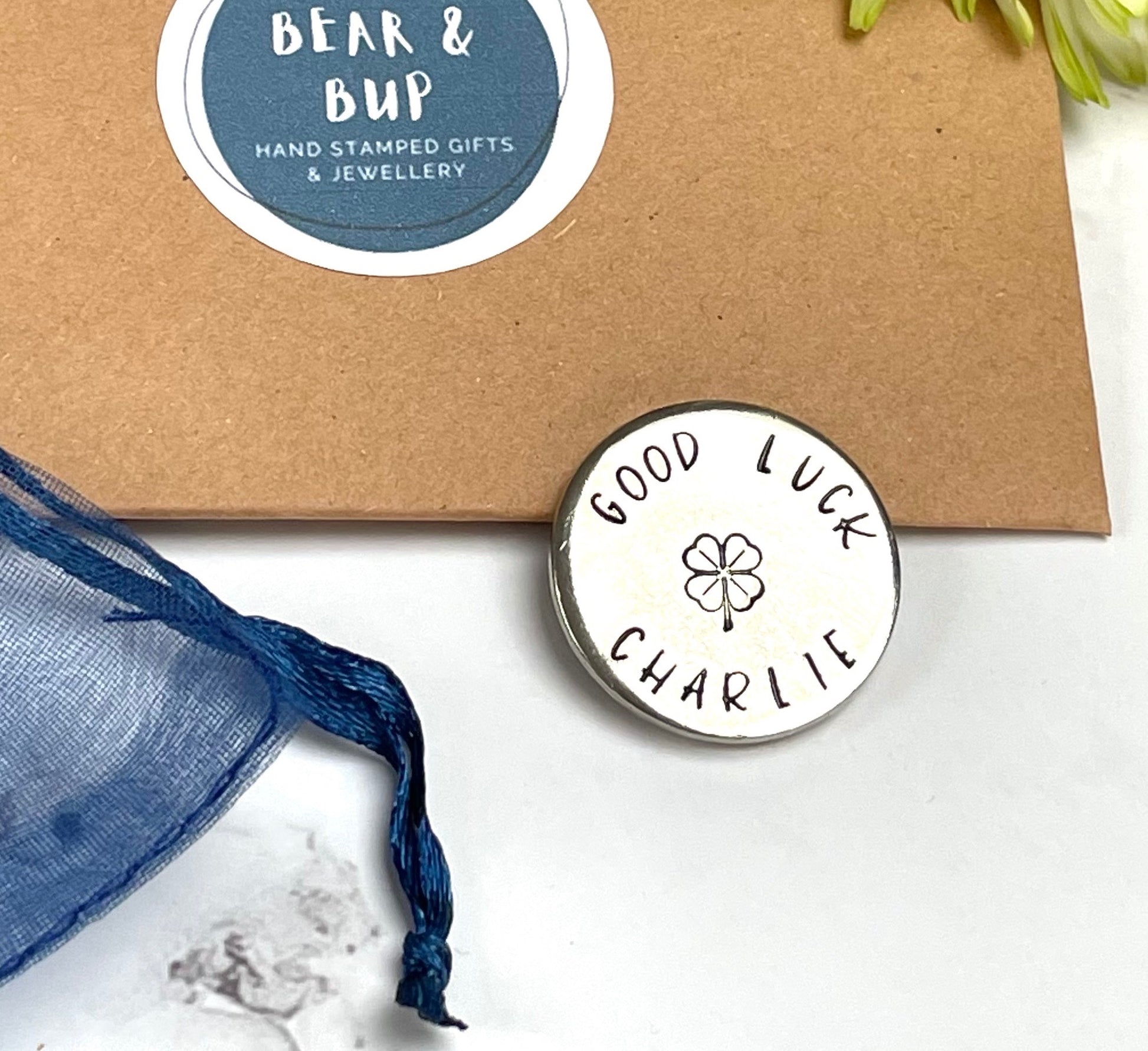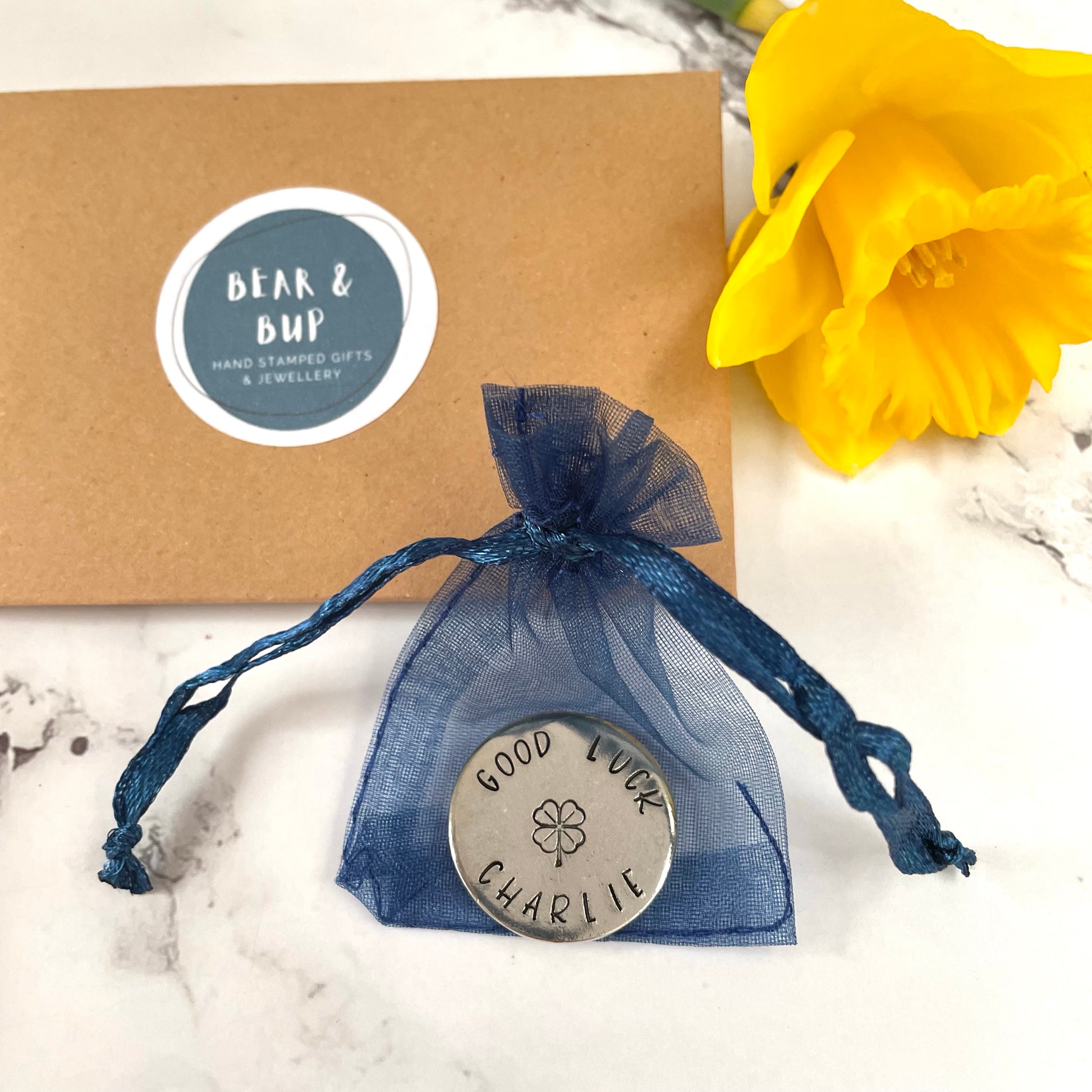 At 25mm wide and 3mm deep, these chunky coins are perfect to carry in your pocket or purse. Each token comes in a blue organza bag in a Bear & Bup envelope.