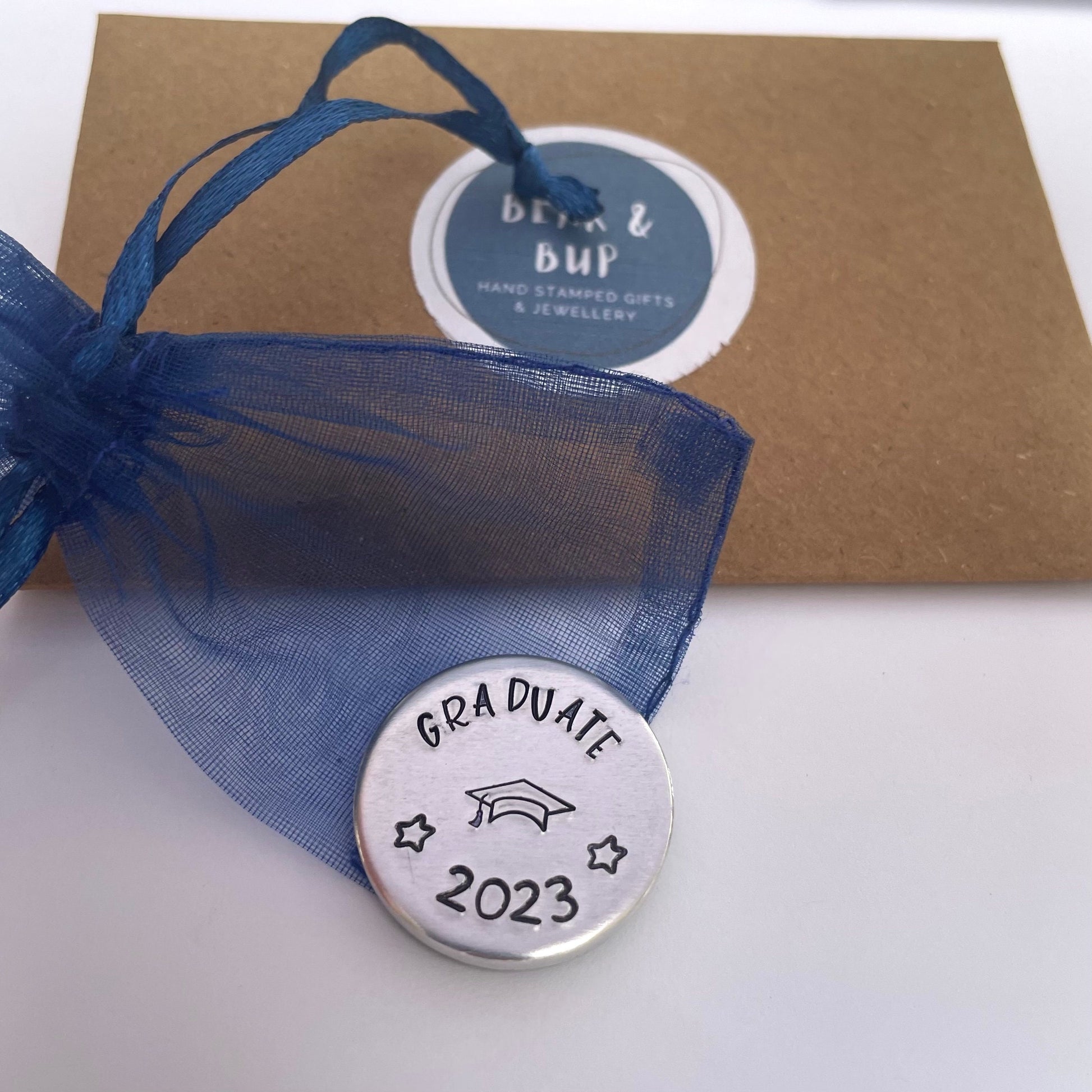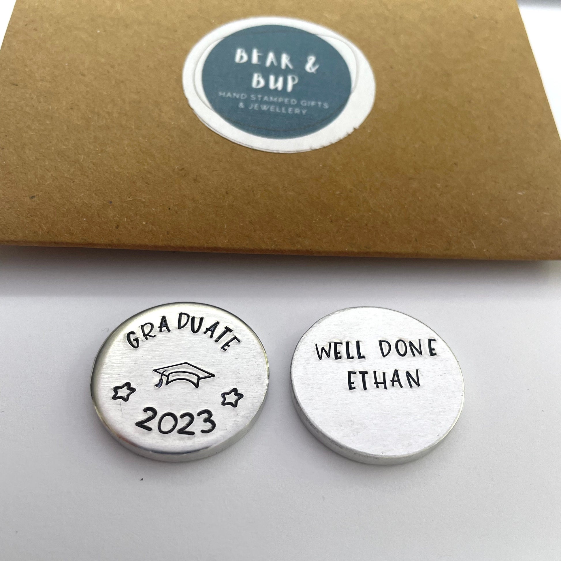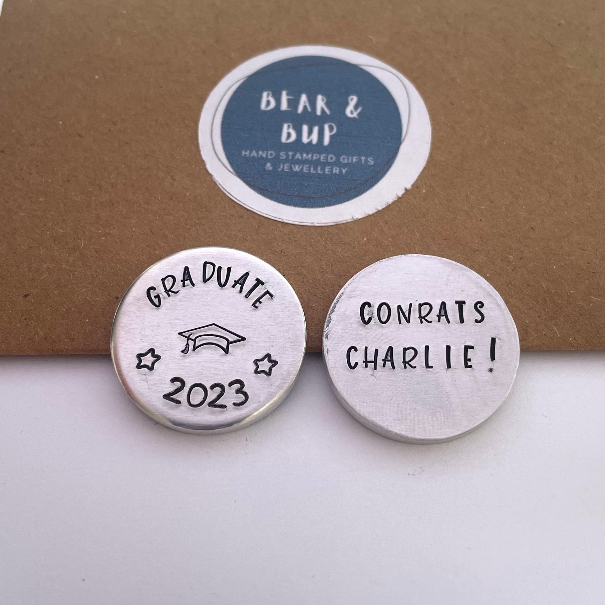 Graduate 2023 pocket token with personalised message on the back. Perfect little keepsake of an amazing achievement!
