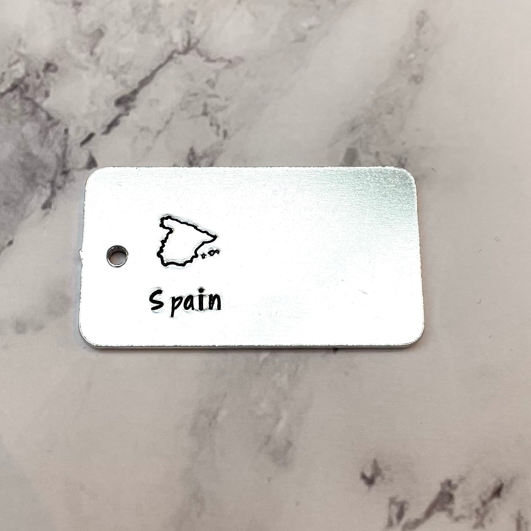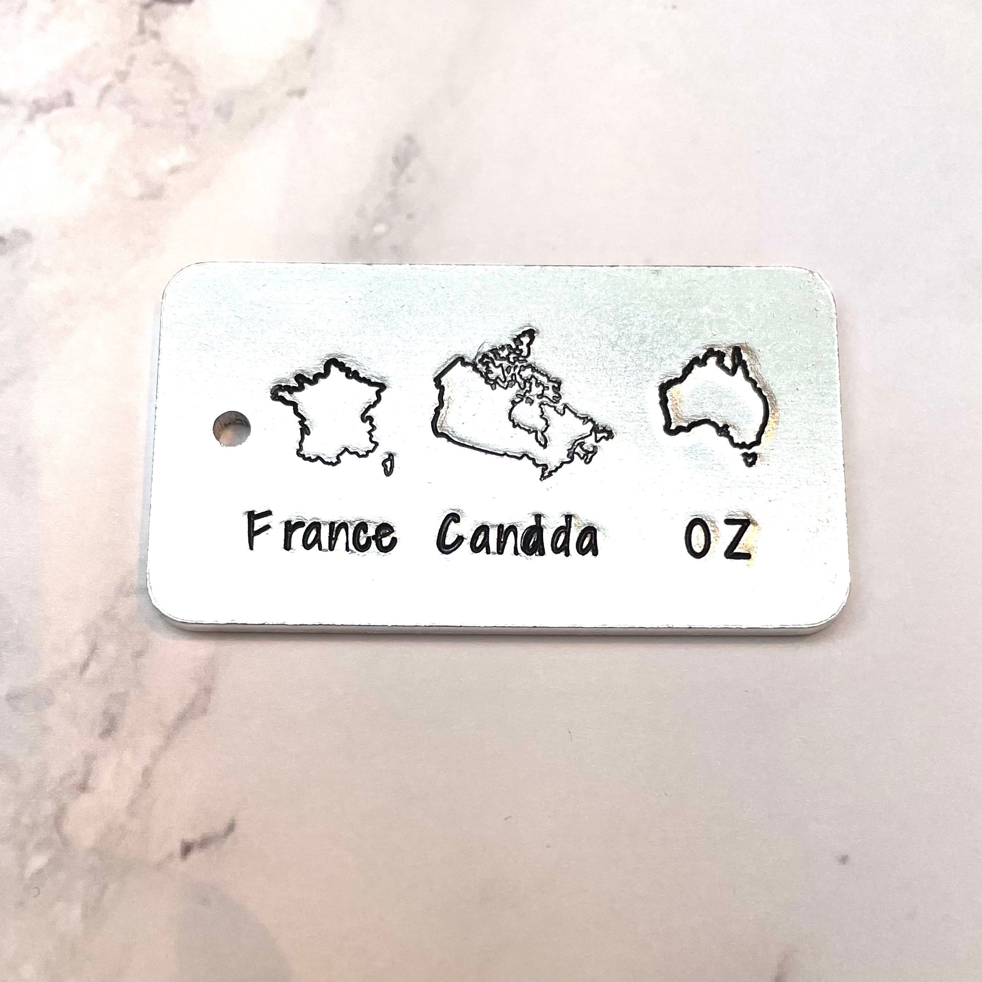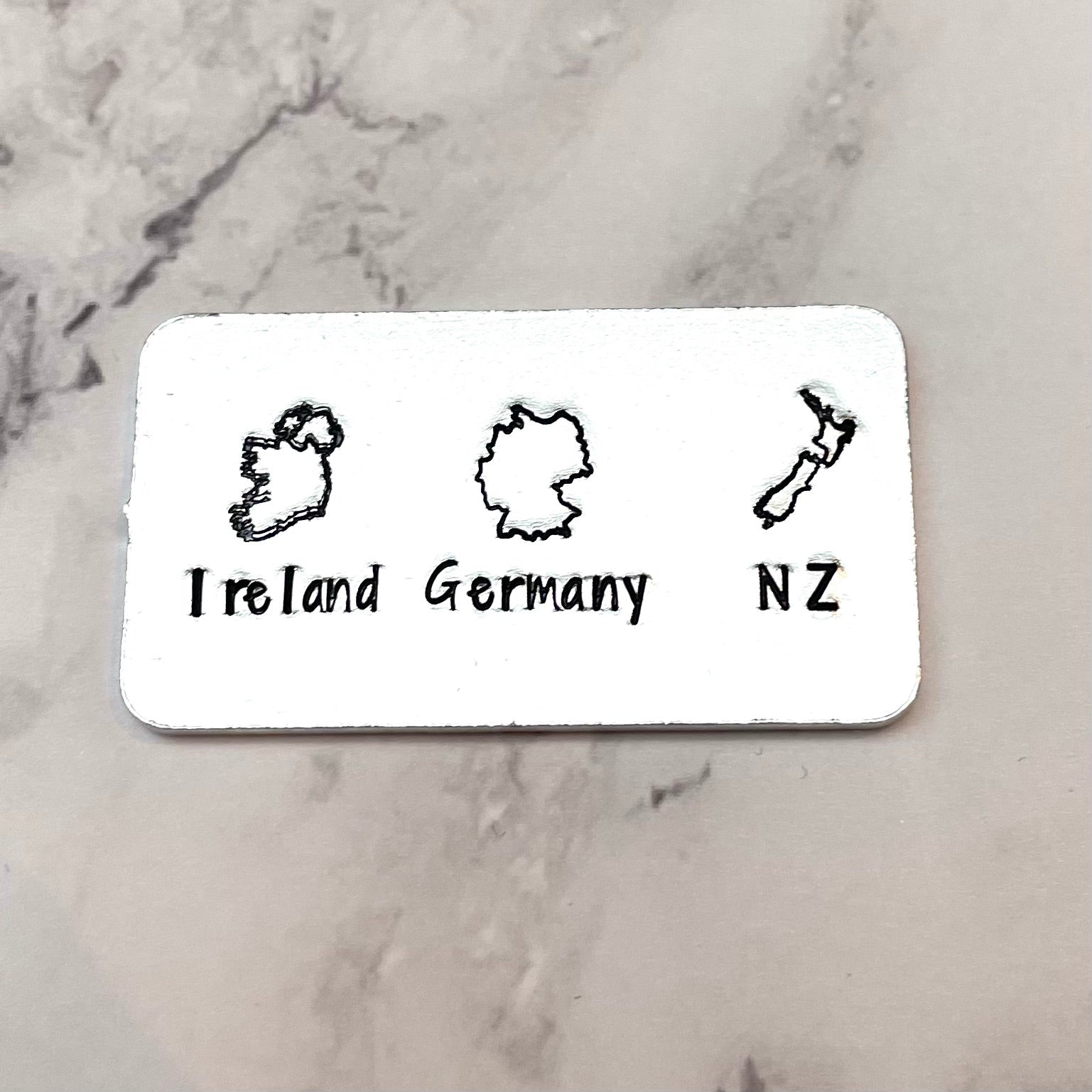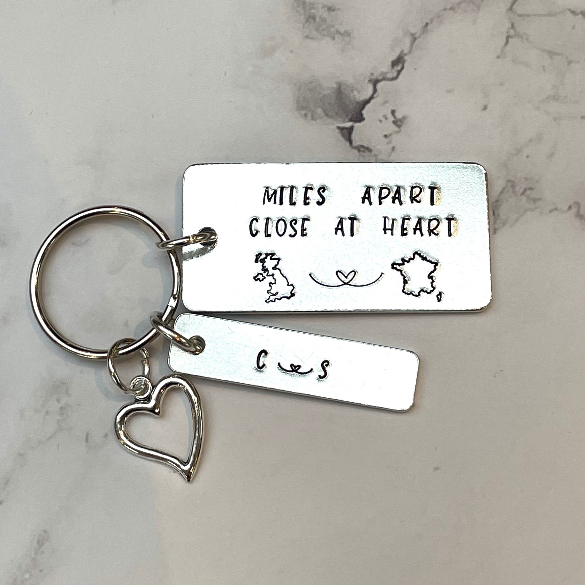 Rectangular aluminium keyring hand-stamped with the words "Miles Apart Close At Heart" and the outlines of the countries you choose. Complete with an open heart charm, it is a lovely gift for someone who lives in another country. Personalised with the addition of tag with initials on and presented in a hessian drawstring pouch.