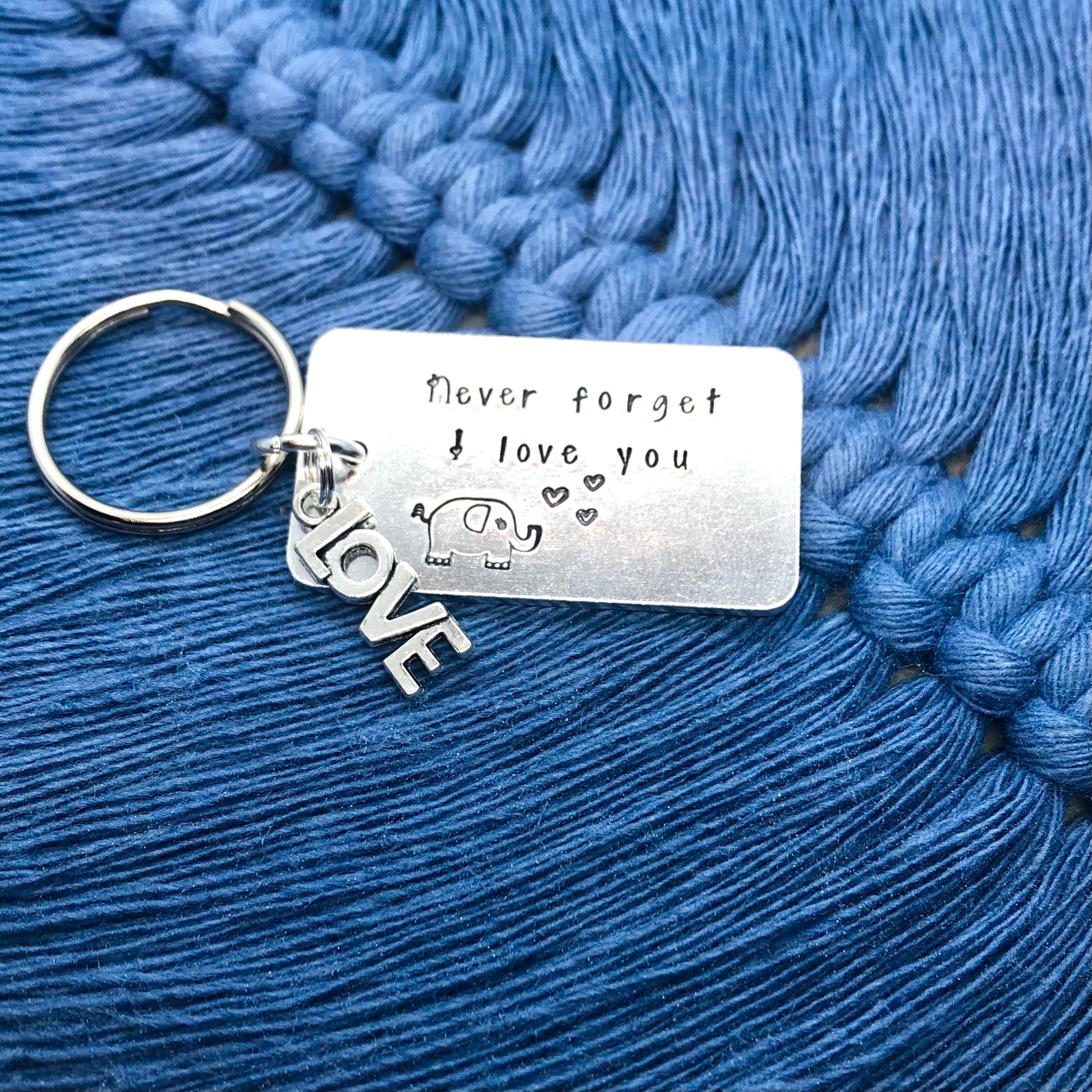 Rectangular aluminium keyring hand-stamped with the words "Never forget I love you" and an elephant design stamp. Complete with a 'LOVE' charm, it is a lovely gift for valentines day. Can be personalised with name tag(s) for an additional cost.