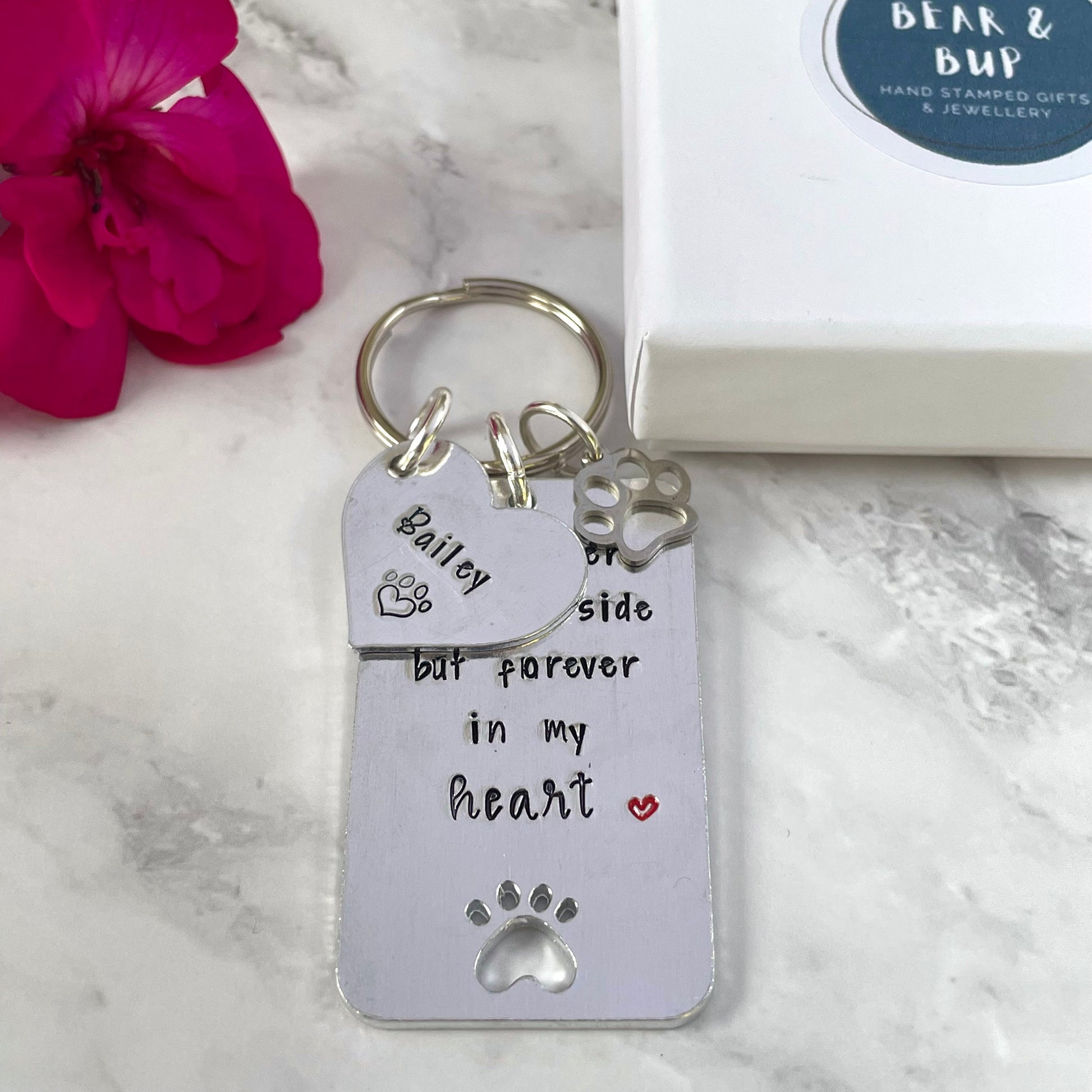 A thoughtful reminder of the loss of a four-legged friend, this rectangular keyring with a cut out paw, comes with a separate heart name tag for your pet as well as a paw print charm.