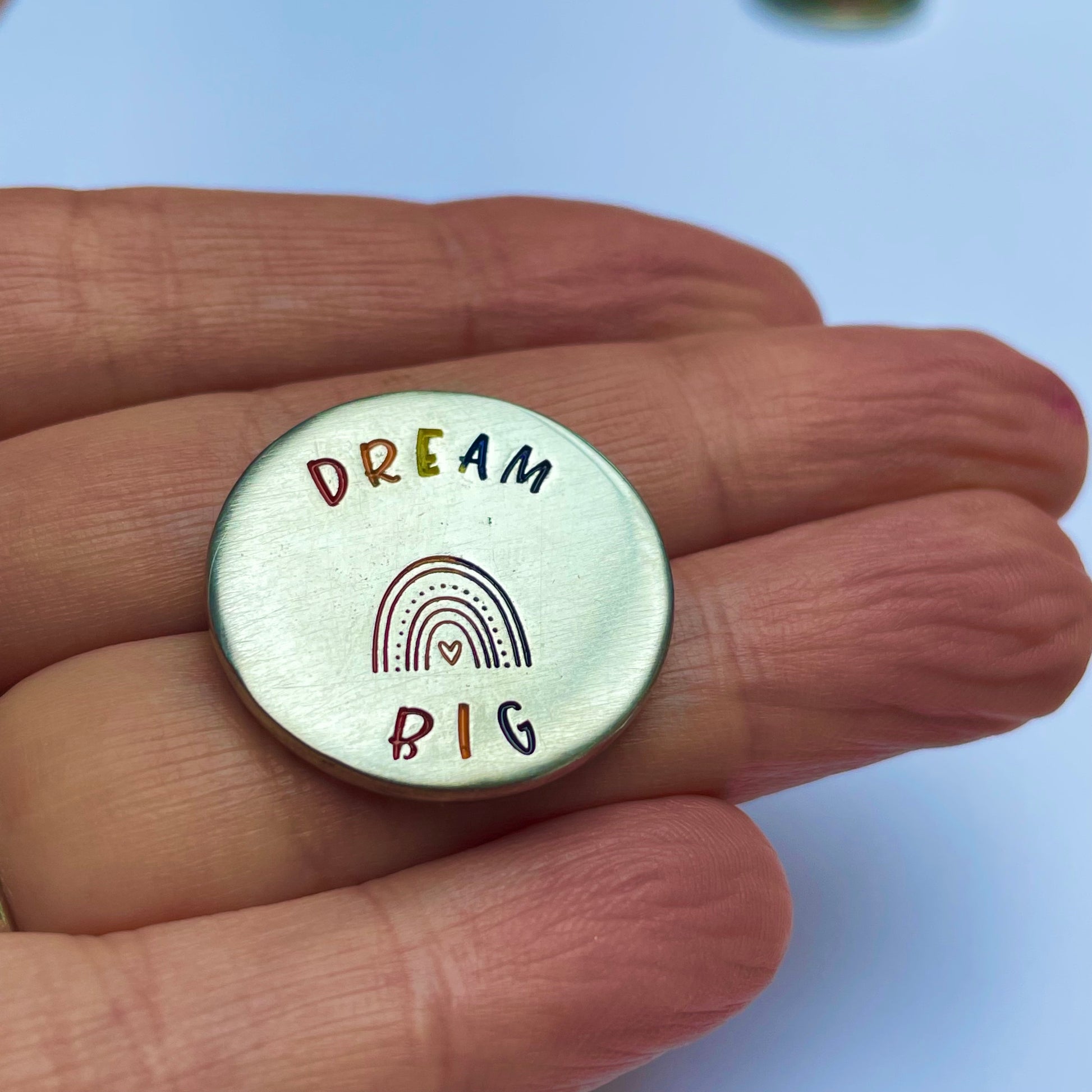 Hand-stamped chunky pewter coin token with rainbow design and choice of words, in rainbow colours.